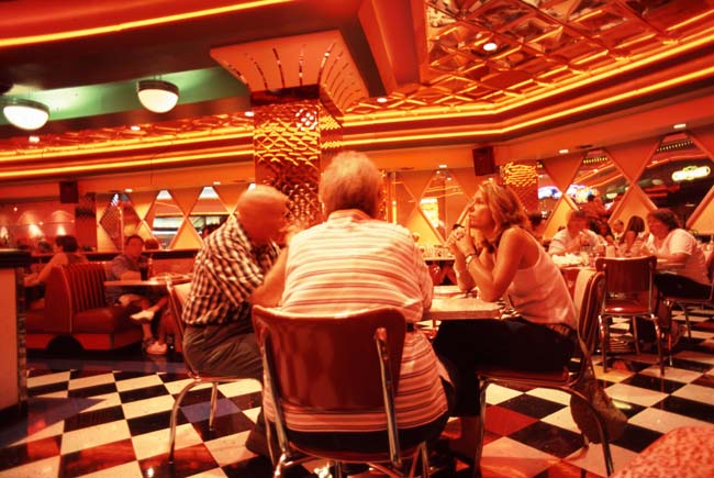 TO BYŁA KLIMATYCZNA RESTAURACJA W STYLU LAT 60 ZE ŚPIEWAJĄCYMI KELNERKAMI. ZJEDLIŚMY TU HAMA I DOGA.